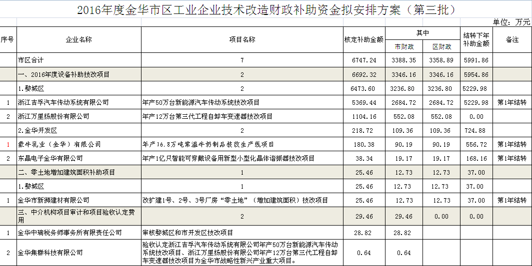 根據(jù)金華市人民政府《關于進一步推進工業(yè)有效投資的通知》(金政發(fā)〔2012〕92號)、《金華市人民政府關于加快培育現(xiàn)代產業(yè)體系打造先進制基地的通知》(金政發(fā)〔2016〕40號)、《金華市人民政府辦公室關于支持工業(yè)企業(yè)技術改造有關政策的意見》(抄告單〔2016〕53號)和《關于申報2016年度金華市區(qū)工業(yè)企業(yè)技術改造補助資金的通知》(金經信技投[2017] 32號)等文件要求,確定工業(yè)技改補助資金審計方式和擬安排方案。現(xiàn)已得出審計結果,并將擬支持的項目及補助金額公示如下:
