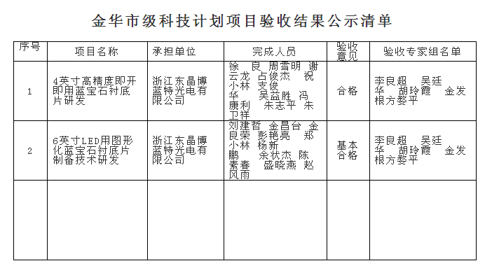根據(jù)《金華市級(jí)科技計(jì)劃項(xiàng)目驗(yàn)收管理辦法》(金市科字〔2015〕83號(hào))規(guī)定,現(xiàn)將浙江東晶博藍(lán)特光電有限公司承擔(dān)的《4英寸高精度即開即用藍(lán)寶石襯底片研發(fā)》和《6英寸LED用圖形化藍(lán)寶石襯底片制備技術(shù)研發(fā)》2個(gè)市級(jí)科技計(jì)劃項(xiàng)目驗(yàn)收結(jié)果予以公示,接受社會(huì)監(jiān)督,公示期從2017年7月31日至8月6日止。任何單位和個(gè)人對(duì)驗(yàn)收意見持有異議的,應(yīng)當(dāng)在公示期內(nèi)書面向市科技局提出異議,單位應(yīng)采用書面形式并加蓋公章,個(gè)人應(yīng)采用實(shí)名提出異議。